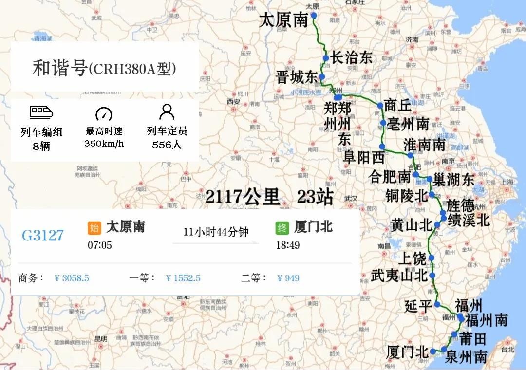 太原到厦门唯一一趟高铁:G3127次,太原南站开往厦门北站,也是太原到黄山、上饶、武夷山、福州、厦门唯一一趟高铁,经郑太高铁、郑徐高铁、合杭高铁、合福高铁、福厦高铁运行,2117公里,中途停靠长治东、晋城东、郑州、郑州东、商丘、亳州南、阜阳西、淮南南、合肥南、巢湖东、铜陵北、旌德、绩溪北、黄山北、上饶、武夷山北、延平、福州、福州南、莆田、泉州南站21个站。