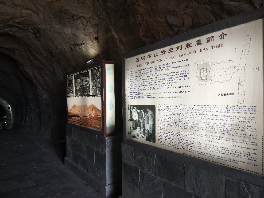 刘胜墓全长约52米,最宽处约38米,最高处约7米,由墓道、车马房、库房、前堂和后室组成。窦绾墓与刘胜墓结构大致相同。两座大墓均开凿于陵山主峰之上,相隔约100米,此外位于陵山南坡还有18座小型陪葬墓,目前没有发掘!