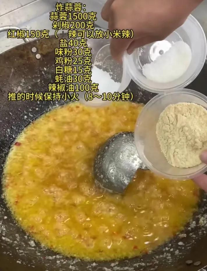 起锅烧热,放入菜籽油烧到 160 度,少量多次放入蒜蓉,蒜蓉不要打的太碎,颗粒状即可。把蒜蓉用清水冲洗一遍,去除一些辛辣喂,味道更好。