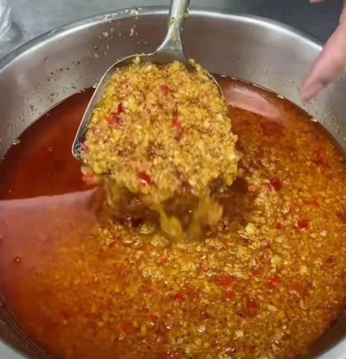 熬制过程一直小火慢熬,不停搅拌防止糊锅,然后加入剁好的辣椒继续推动搅拌,两分钟后放入调味料,1500克蒜蓉,放入200克剁椒,150克小米椒(可适当调节),40克盐,30克味粉,25克鸡粉,15克白糖,30克耗油,100克辣椒油,保持小火熬制8到10分钟。