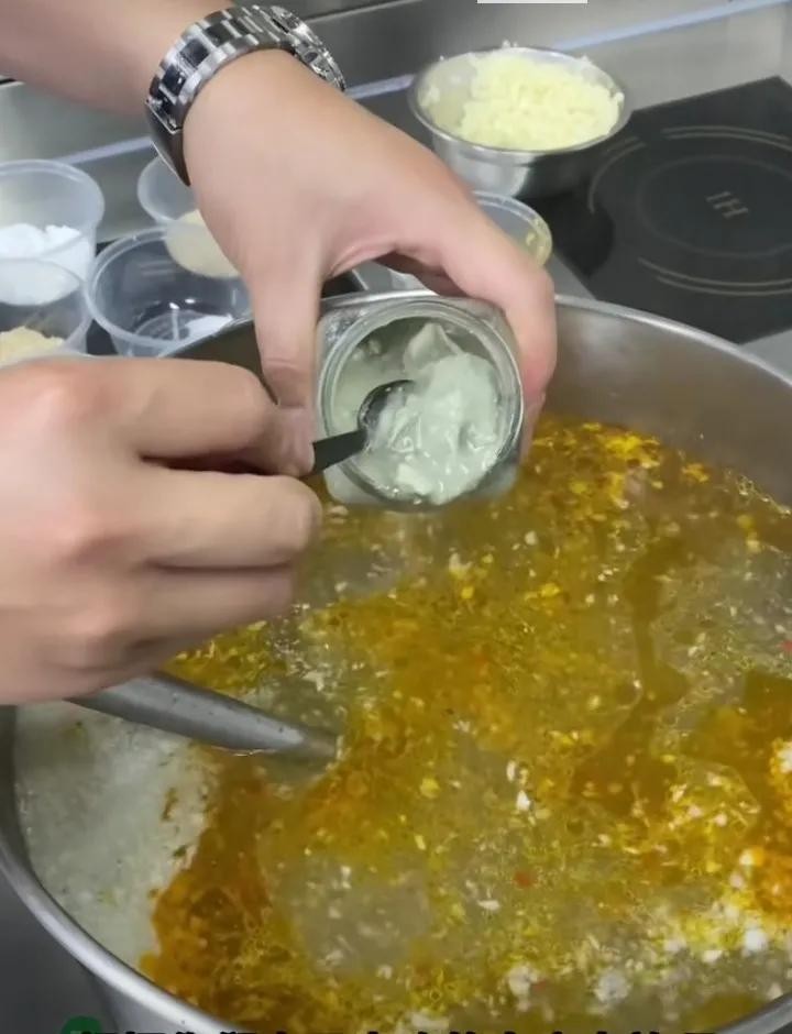 准备20斤高汤烧开,下入100克生蒜蓉,再加入一碗刚才炸好的的蒜蓉酱,加入臭豆腐乳(可根据到底喜欢的臭度来放),最后加入80克盐,臭豆腐专用辛粉50克,鸡粉80克,排骨味王50克,鲜味宝30克,煮开即可使用。