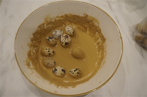 将新鲜的没有放过冰箱的鹌鹑蛋放到皮蛋粉糊中滚一圈,涂满一层薄泥。