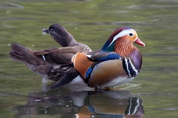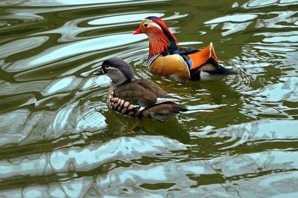 3、鸳鸯的体型为中等,公鸳鸯体长大约43cm,羽色绚丽,其腹部白羽,背部红褐色,头披有红、绿、紫色和白色组成的华丽羽冠,较内两枚三级飞羽扩成扇形而竖立成饰羽,眼为棕色,眼后有白色眉纹,母鸳鸯体型稍小,背部为褐色,腹白,无羽冠及饰羽,因公母鸳鸯羽毛差异明显,所以容易识别。