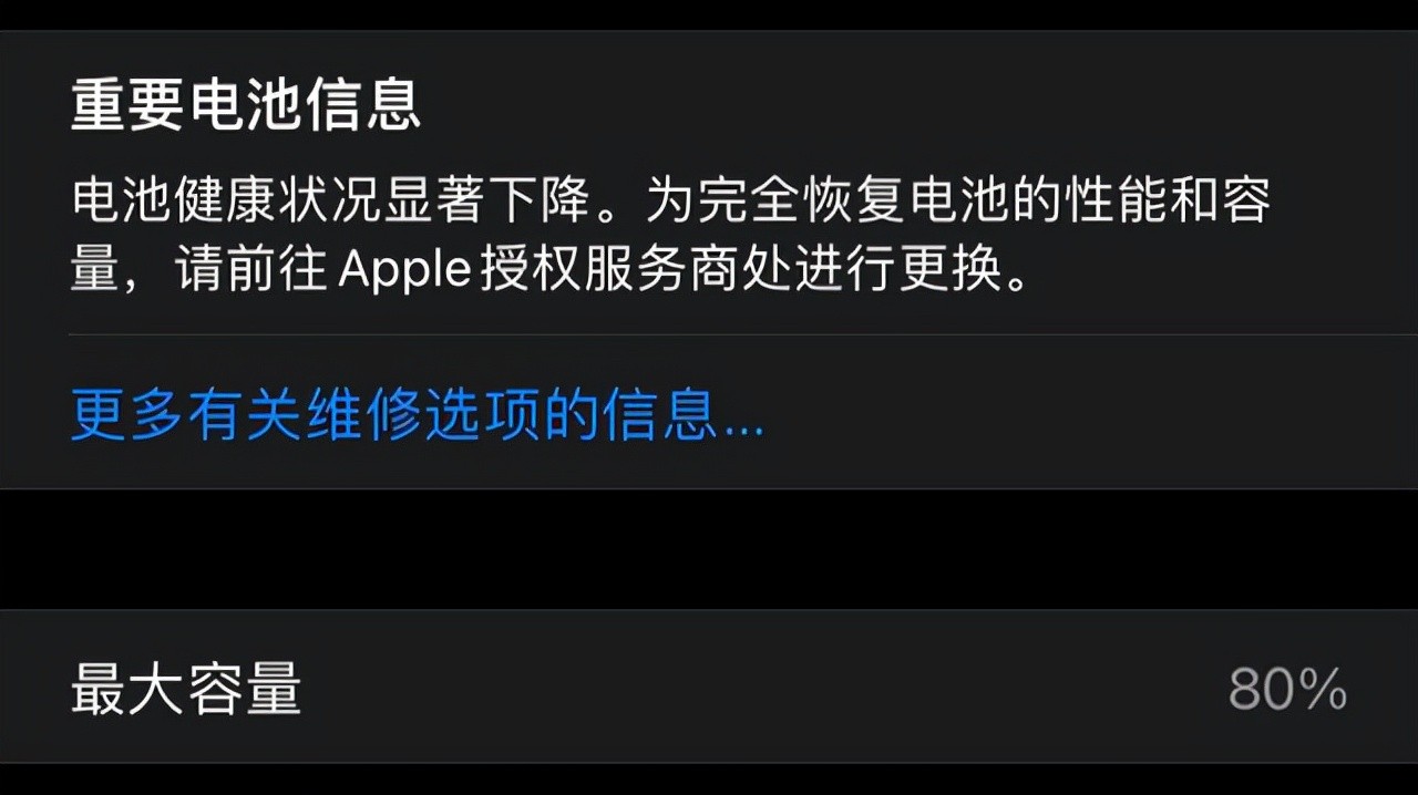 这句话读起来可能有点绕,简单来说就是苹果的锂电池在设计之初所采用的设计标准就是在完成500次充放电周期后还能剩余至少80%以上的电池容量, 如果电池健康的值低于80%苹果就会在系统中提示你——“电池健康状况显著下降。为完全恢复电池性能和容量,请前往Apple授权服务商处进行更换”,也就是说,苹果对于电池健康所设置的门槛是80%。