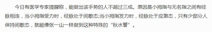 还好有医学专家出来解答了,据专家表示能做出“秋水誓”的人不超过三成,原因是小指与无名指之间有经脉相连,当小指受力时,经脉处于间歇态;当小指发力时,经脉处于应激态,只有少部分人保持间歇态,就能像张一山一样做到“秋水誓”↓