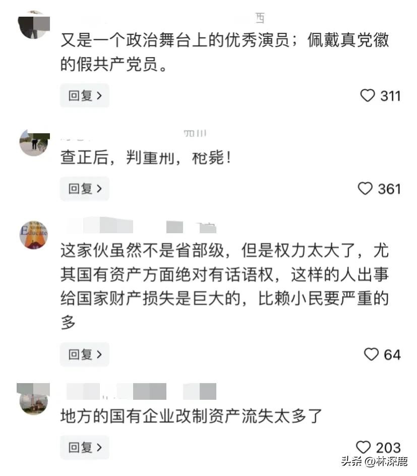 看看网友们怎么说吧!有人说:“又是一个政治舞台上的优秀演员;佩戴真党徽的假共产党员。”还有人讲地方的国有企业改制资产流失太多了”另有人讲:“国有资产就是这些贪官给搞坏的,应该严惩,枪毙。”