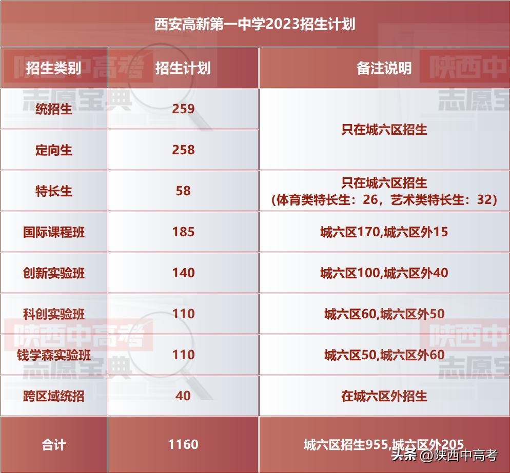 2023年高新一中的招生计划是1160人(包含南校区)。总数没变,国际课程班增加了30个,统招和定向相对减少。其中城六区955人,城六区外 205人。这1160个名额里,包含统招生299人(其中城六区外40人),定向生258人, 特长生58人,以及特色班型545人(其中城六区外165人)。具体有:国际课程班185人,科创班110人,创新实验班140人,钱学森实验班110人。定向生和特长生基本都放在南校区。