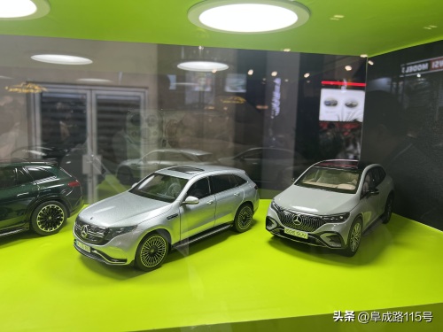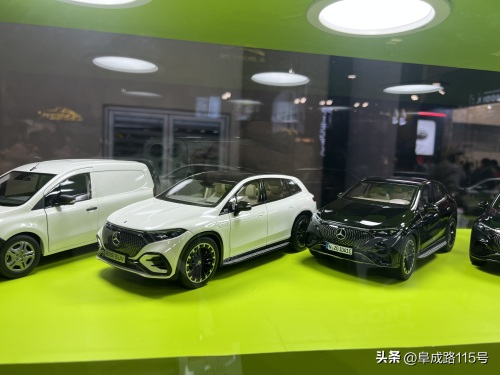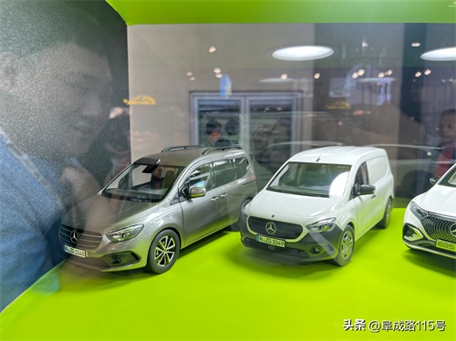 KILO品牌的站台以绿色为主,展柜中的展品涵盖了奔驰主流的纯电SUV,包括EQC、EQE SUV和EQS SUV,以及奔驰T级车,看着像面包车,实际上定位为紧凑型MPV。