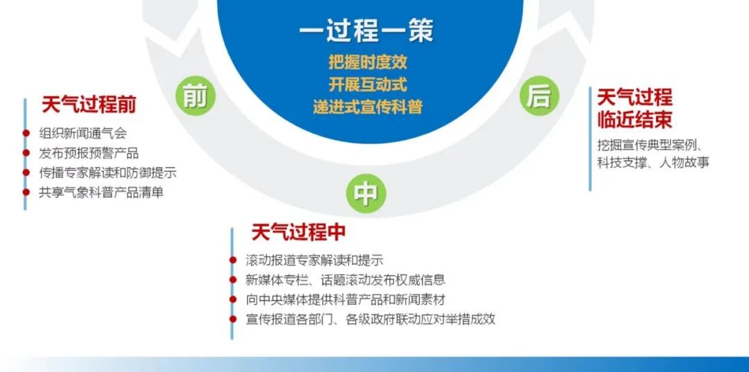 中国气象局气象宣传与科普中心(中国气象报社)密切关注灾害性天气发展态势,适时组织开展国省宣传科普会商;组建“一过程一策”国省市县信息共享微信群,滚动提供宣传科普产品;组织媒体通气会,通过“绿色通道”机制向主流媒体推送预报预警、风雨实况、专家解读等内容……