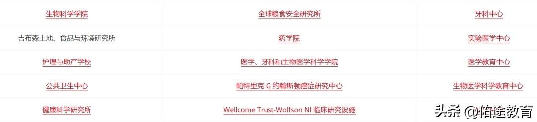 贝尔法斯特女王大学(Queen's University Belfast)的学院结构经过整合,目前主要由 三个学院(Faculty) 构成,每个学院下设多个学部(School)或研究中心。
