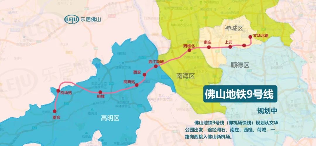 据此前的规划显示,佛山地铁9号线又称机场(轨道)快线,横跨佛山禅城、南海、高明等区,将从文华公园出发,途经澜石、南庄、西樵,一路向西接入广州新机场。