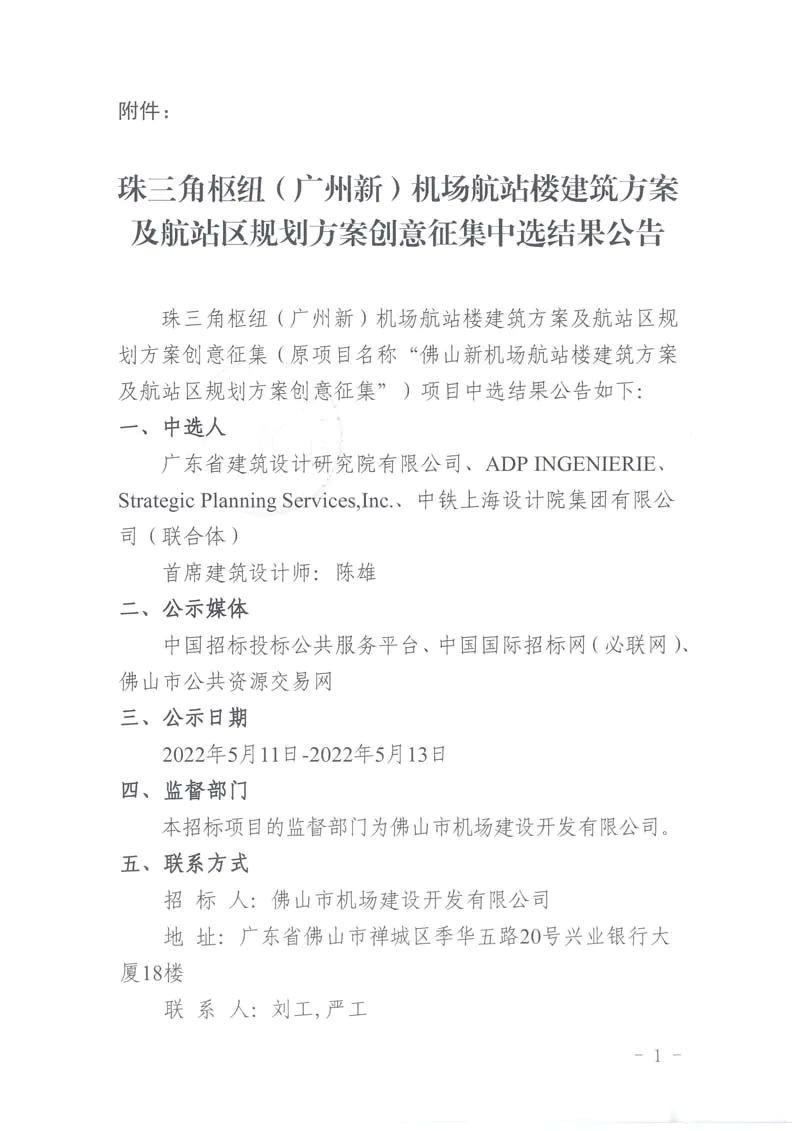 5月10日,由广东建筑设计研究院有限公司牵头,成员包括法国ADPi、SPS航空规划咨询、中铁上海设计院集团有限公司的项目联合体,确定为珠三角枢纽(广州新)机场航站楼设计方案的中标单位。