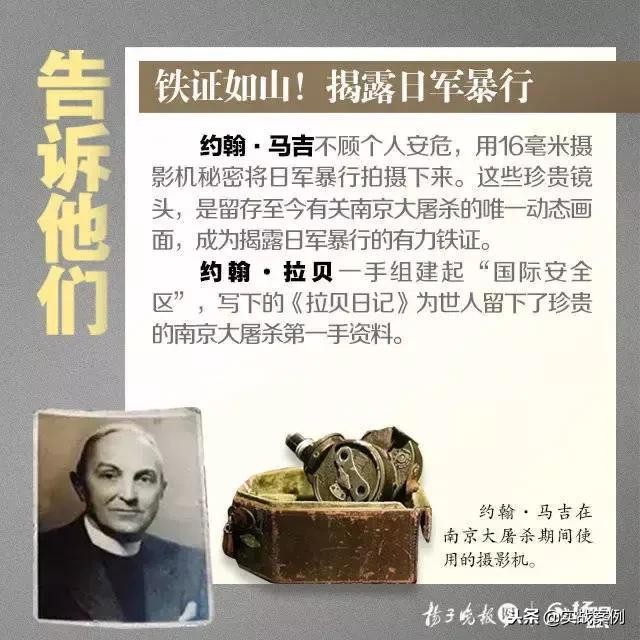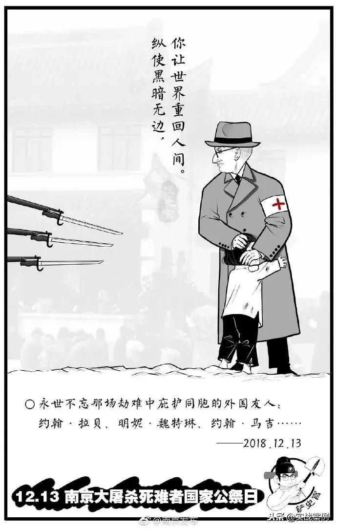 这张漫画海报很有涵义,三把锋锐刺刀指向相互拥抱的一老一少,这不仅纪念第五个南京大屠杀死难者国家公祭日,更是表达对当初在劫难中包庇同胞的外国人的纪念与尊敬。