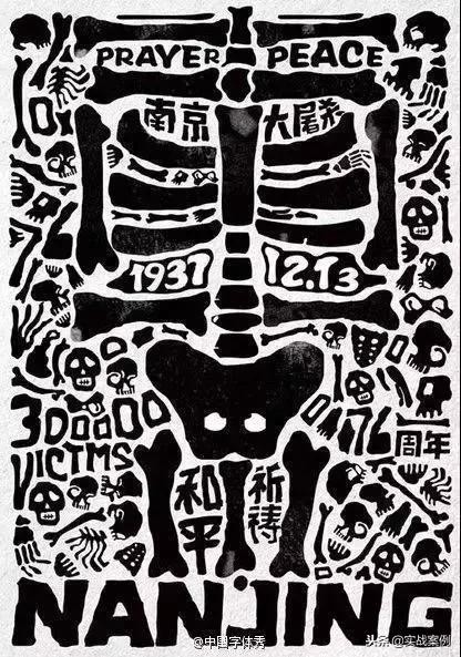 看似惊悚的画面,仔细一看,却戳中了人心,由一个个“骷髅”型拼摆出关键字眼,比如:“300000、和平、祈祷等等,不得不让人在“惊吓中”永记了南京大屠杀历史事件。