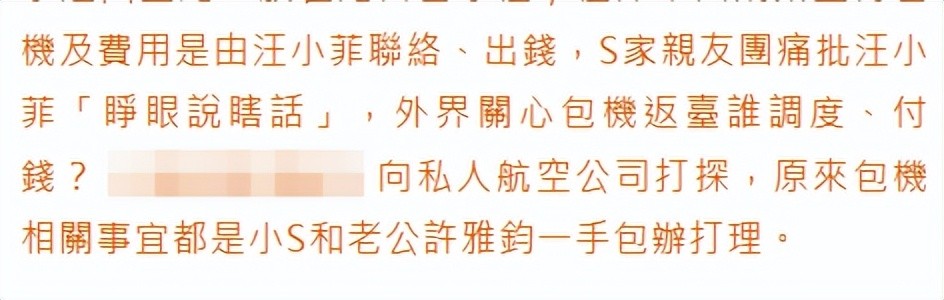 台媒咨询了航空公司,对方表示包机相关事宜都是小S和老公许雅钧一手包办打理,也就是说,出钱的人是小S和许雅钧。