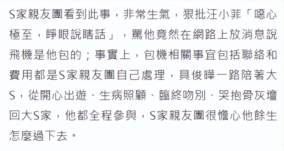 大S家人表示包机相关事宜包括联络和费用都是S家亲友团自己处理,具俊晔一路陪着大S,从开心出游、生病照顾、临终吻别、哭抱骨灰坛回大S家,他都全程参与,S家亲友团很憺心他余生怎么过下去。