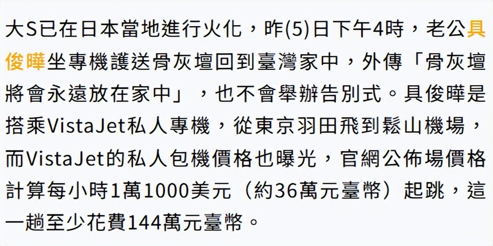据悉,大S的骨灰由某航空公司提供私人包机运回台湾,老公具俊晔一路护送回家,该公司官方公布的价格,每小时飞行费用约1.1万美元,从日本飞到中国台湾至少要144万台币,折合人民币32万。