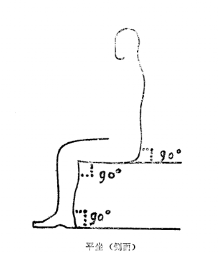 2)双腿可平坐,也可单盘和双盘,初学者平坐即可。取高矮适当的坐具,端坐于上。两条大腿平放,分别与两小腿成90°(即膝部为直角)。双脚分开,距离同肩宽,脚尖朝前。脚与小腿的垂直线成90°直角。上身不要后仰,背更不能死死地靠在硬的椅背上,免得影响督脉中气的运行。上身与大腿也成90°直角。但是,身体各个部位都要放松,不能死板。