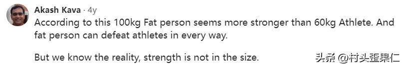 Akash Kava认为“中国GDP比印度高,不代表中国比印度强”,他还用了一个非常有意思的比喻:100公斤的胖子似乎比60公斤的运动员更强壮,胖子可以在各个方面击败运动员,但是我们都知道,实力并不在于大小。