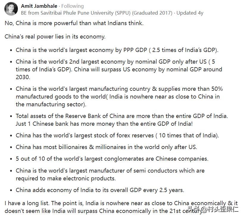 接下来的回答来自一名机械工程师Amit Jambhale,他硕士毕业于萨维特里巴伊·菲勒浦那大学,他也认为中国比印度人想象的更强大。并且从购买力平价GDP、名义GDP、中国制造业、银行储备、外汇储备等方面做了中印对比,中国每个方面都是几倍于印度。他说,他还有很长一份清单用来比较印度和中国的差距,说个三天三夜也说不完。他甚至说,印度经济可能在21世纪都无法赶上中国。