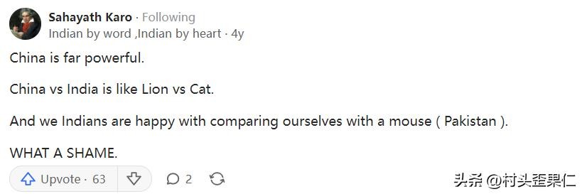 先来看一个比较简短的回答,来自印度网友Sahayath Karo。他说,其实中国远比我们想象的要强大,中国对比印度就像狮子对比小猫咪,而我们印度人却总喜欢拿自己和小老鼠(巴基斯坦)对比,我都觉得丢脸。