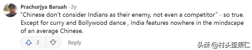 Prachurjya Baruah说:中国人不认为印度人是敌人,甚至连竞争对手都算不上,我很赞同这句话,除了咖喱和好莱坞舞蹈之外,印度在大多数中国人眼中,没有任何特色。
