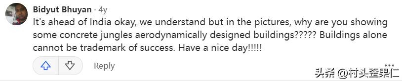Bidyut Bhuyan首先表示不服:你说中国领先于印度,好吧,我们理解,可是你为什么要在图片中展示一些混凝土丛林建筑?建筑物并不能成为成功的标志!