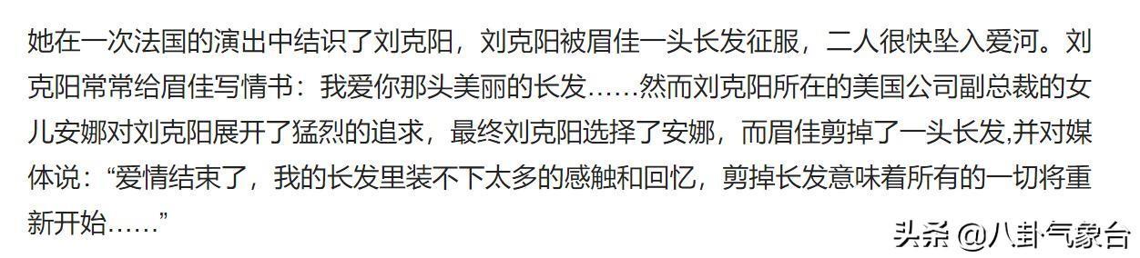 最早传出她在国外认识了一个华裔,两人跨国恋谈了一年多,但后来两人还是分手了,眉佳因此剪掉了多年的长发。