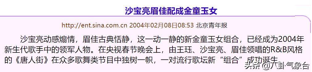 其中2004年,沙宝亮和眉佳在春晚舞台上演唱《唐人街》,还因此还被媒体誉为“金童玉女”的搭档。