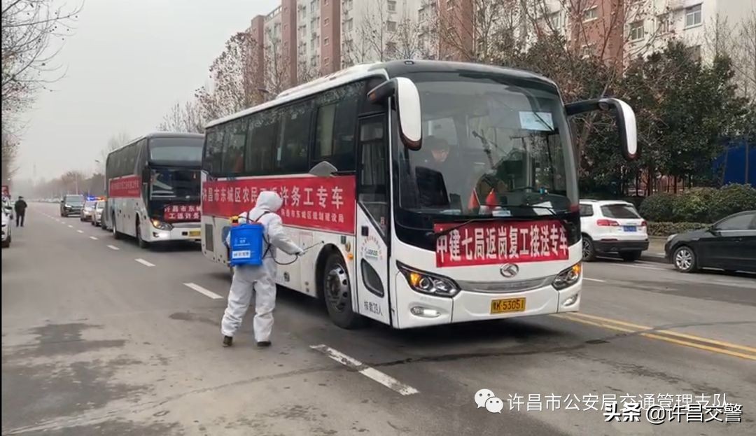 当远赴四川眉山的返许务工专车车队抵达许昌,许昌市公安局交通管理支队组织警力在车队所经沿线路段实施交通管控。工作人员严格对车辆进行消毒、逐一登记乘客、核实身份、对乘客进行健康检查、做好消杀,防御病毒侵袭。