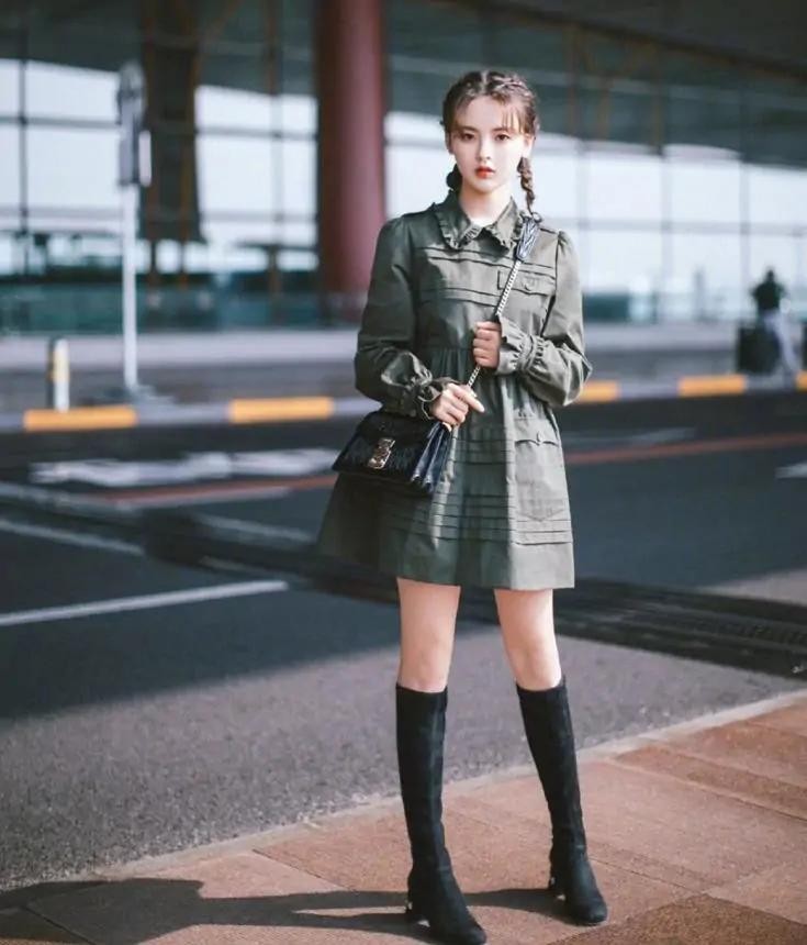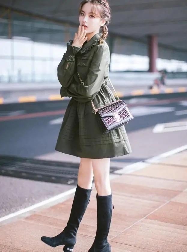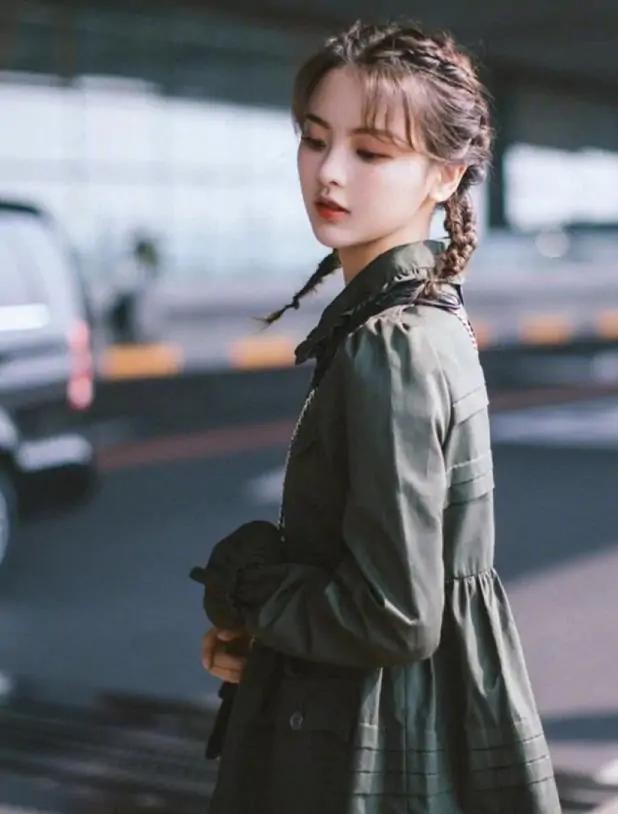 看看杨超越这一身机场穿搭,真的太显少女了,军绿色衬衫连衣裙配黑色鹿皮绒高跟靴,酷飒十足的对不对?双扎起来的小羊角辫,把她衬托得更加可爱俏皮了。那么减龄显嫩的扎发,相信不管谁扎都好看。