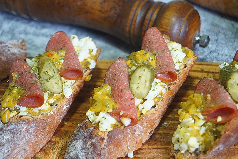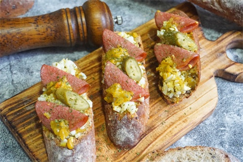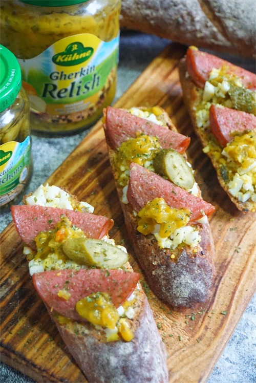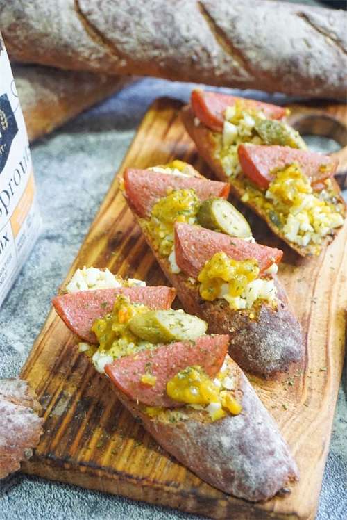 食材:法棍或者欧包片3片,煮熟的鸡蛋1个,冠利青瓜蓉,冠利酸黄瓜仔,萨拉米香肠,欧芹碎。