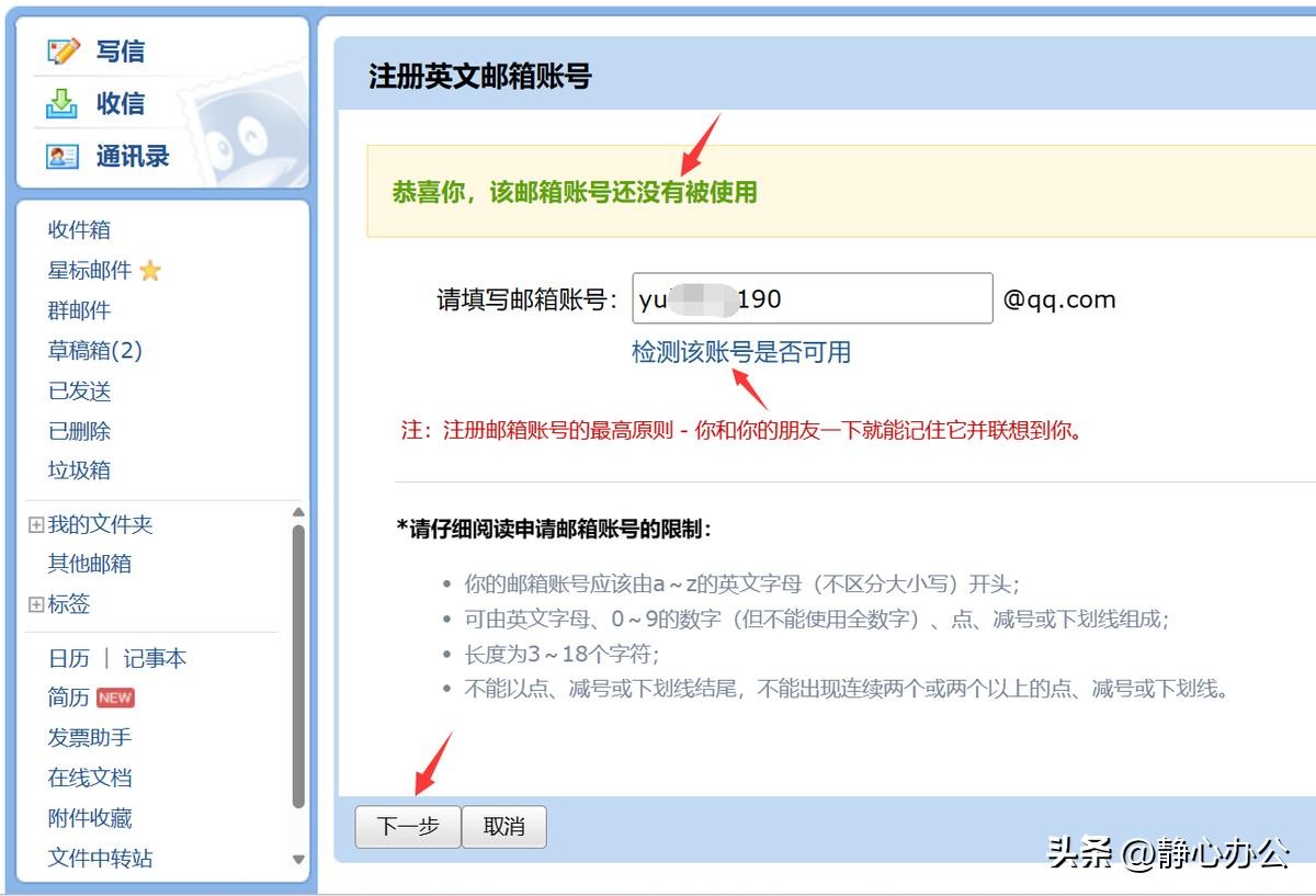 阅读申请邮箱账号的限制条件,在邮箱账号编辑框中输入想要设置的英文邮箱账号,并检测该账号是否可用。经检测可用后,可点击【下一步】按钮。
