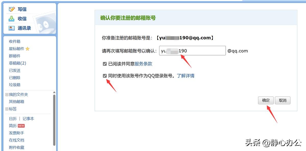 在打开的界面再次填写邮箱账号进行确认,如果想使用该邮箱账号登录QQ,记得勾选【同时使用该账号作为QQ登录账号】,单击【确定】。这样,英文邮箱账号就注册好了。