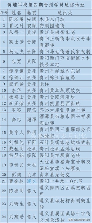 黄埔4期贵州籍学员来自贵州各地,贵阳市和遵义市两地学员人数多一些,贵州学员大多是中学学历。下图是4期贵州学员籍贯和同学录所留通信地址。