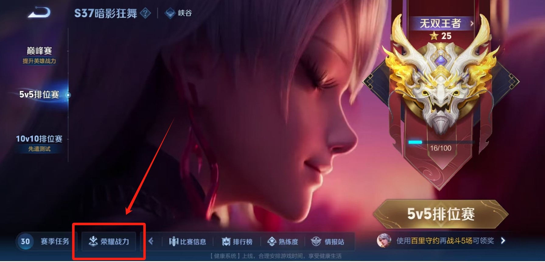 2. 找到荣耀记录:在排位界面中点击下方的“荣耀战力”,会出现下拉隐藏菜单,点击其中的“荣耀战区”。