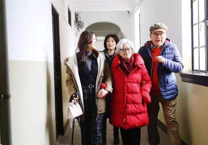 那个时候王文娟94岁,她身穿红衣和自己的外孙女牵手,整个人看着精神奕奕的。