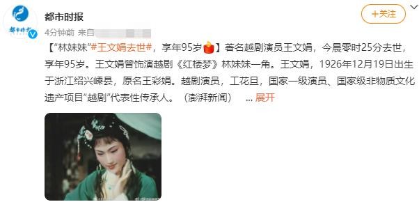 8月6日,有媒体报道称,著名越剧演员王文娟在今晨零时25分去世,享年95岁。
