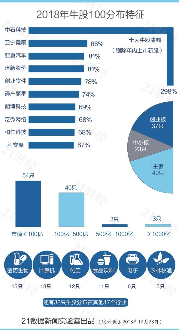21数据新闻实验室对2018年最牛的100股进行透视发现: