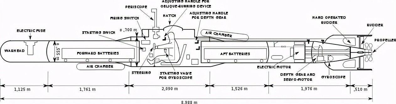 所以到了后期,“回天”鱼雷去掉了乘员逃逸系统的设定,这也就意味着一旦鱼雷发射出去,无论成功与失败,都没有回转的余地了。如果鱼雷攻击失败,操作员可以手动使用一个自毁系统,毁掉鱼雷,不将这款武器留给美军,自毁系统同样不允许操作员逃生。