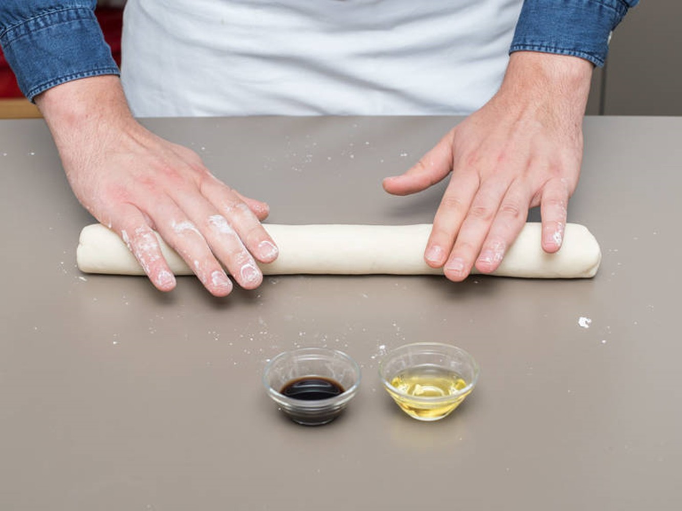 三部曲、用另外一个碗将澄粉、三分之一的淀粉、以及热水混合均匀。确定搅拌均匀之后,用保鲜膜将碗封起来,静置5分钟左右的时间。静置完成之后,在面团之中加入剩余的淀粉和猪油,将面团揉成一个长条形。再次用保鲜膜将这个面团包好,静置10分钟。然后将面团分成小块,每一块都揉成球状。
