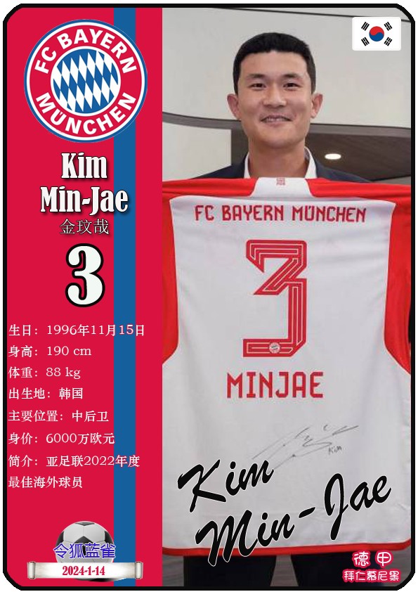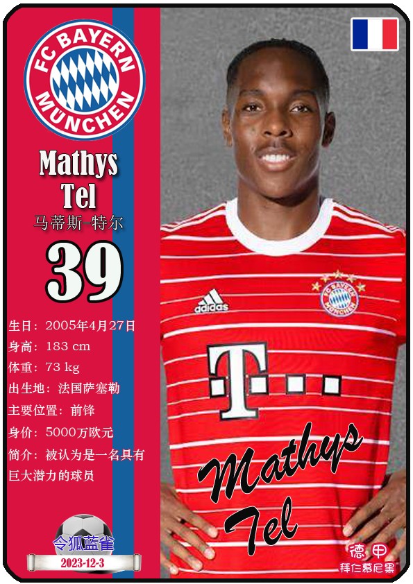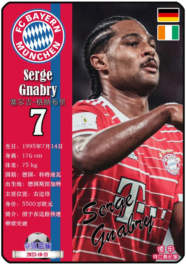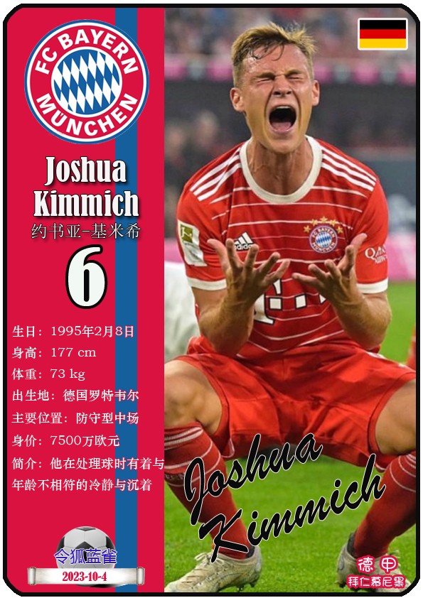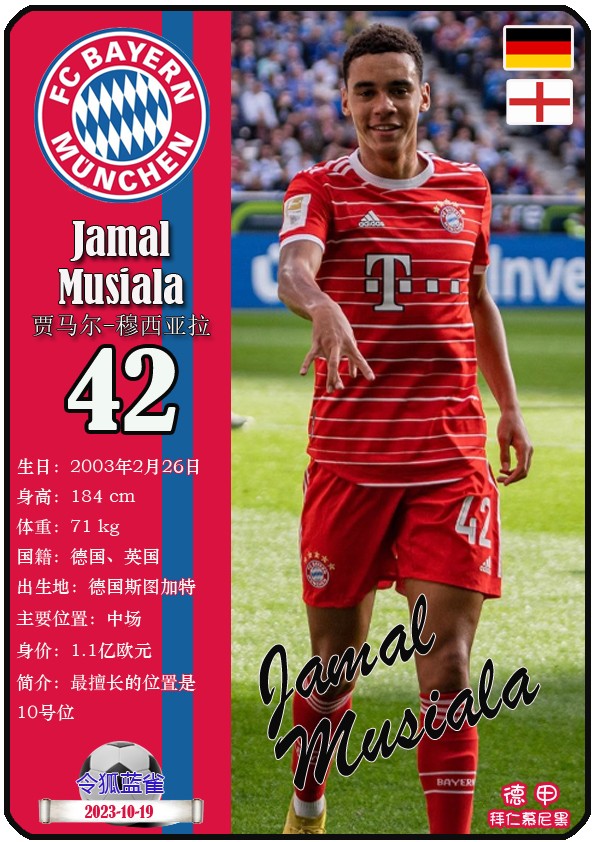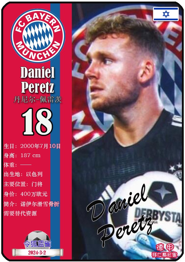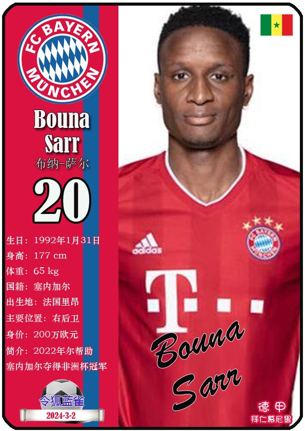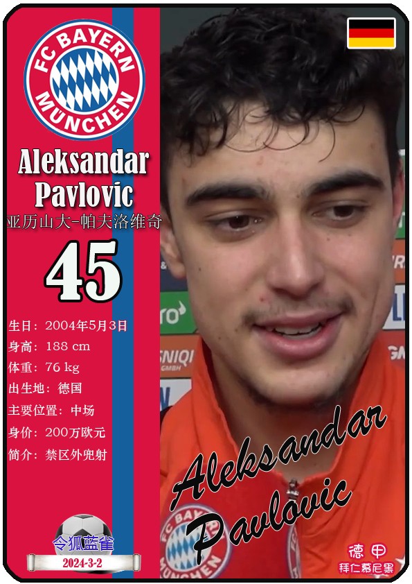 阿方索-戴维斯( 2023-11-25 093156)埃里克-戴尔( 2024-3-2 092106 )埃里克~舒波莫廷( 2024-3-2 001103 )布莱恩-萨拉戈萨( 2024-3-2 001105 )布纳-萨尔( 2024-3-2 092109 )达约-于帕梅卡诺( 2023-12-2 115008 )丹尼尔-佩雷茨( 2024-3-2 092128 )哈里-凯恩( 2023-10)贾马尔-穆西亚拉( 2023-10-19 230841 )金玟哉( 2024-1-14 005106 )金斯利-科晏( 2023-11-19 093200 )康纳德莱默( 2023-12-3 094457 )拉斐尔-格雷罗( 2023-12-3 094509 )莱昂-格雷茨卡( 2023-12-3 094501 )勒鲁瓦-萨内( 2023-11-10 232214 )马蒂斯特尔( 2023-12-3 094516)马泰斯德里赫特( 2024-3-2 092112)诺塞尔-马兹拉维( 2024-3-2 092117 )乔纳-库西阿萨雷( 2024-3-2 001108 )萨查-博伊( 2024-3-2 092114 )塞尔吉_格纳布里( 2023-10-21 124543 )斯文-乌尔赖希( 2024-3-2 092125 )塔雷克-布赫曼( 2024-3-2 092119 )托马斯-穆勒( 2023-12-3 094512 )亚当阿兹努( 2024-3-2 092122 )亚历山大-帕夫洛维奇( 2024-3-2 092103 )约书亚基米希( 2023-10)