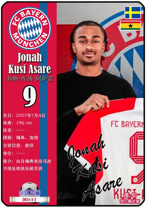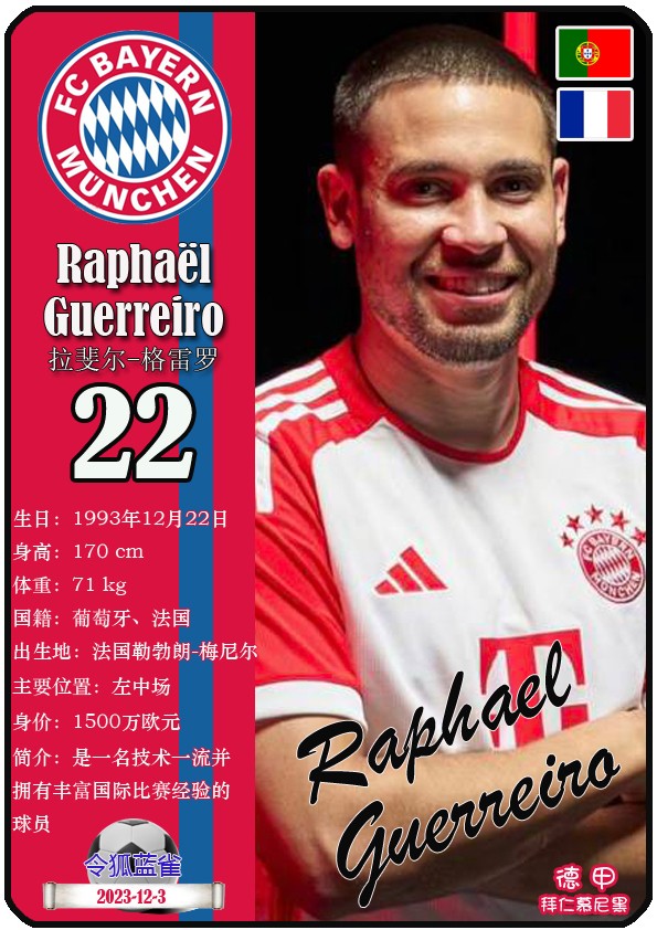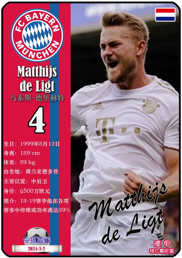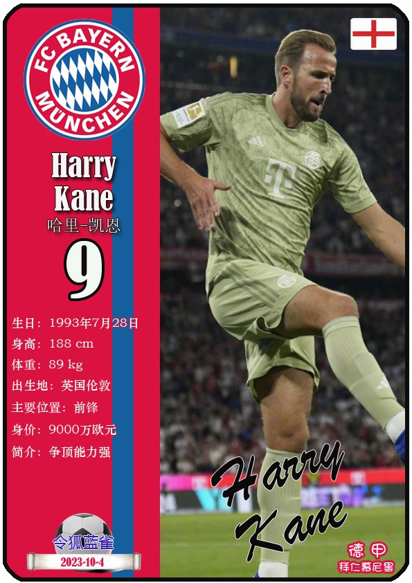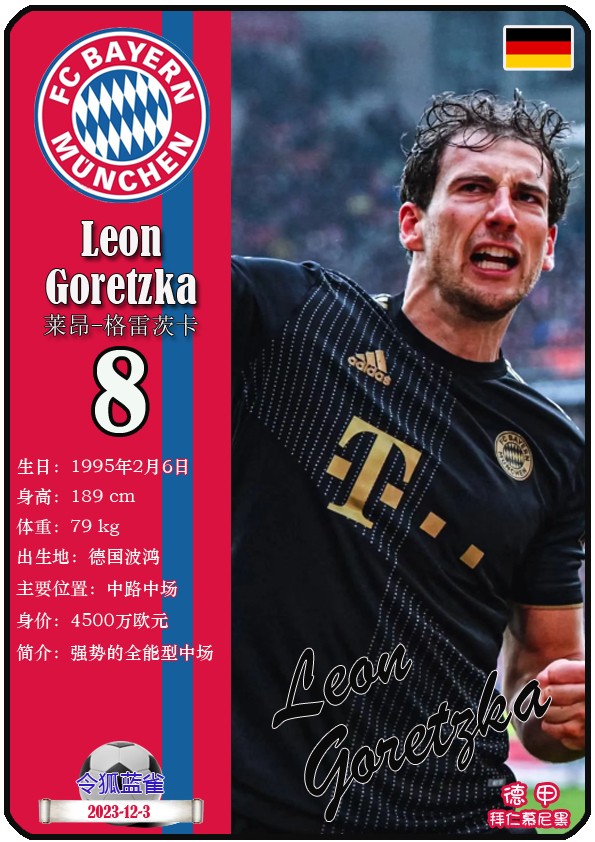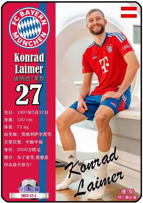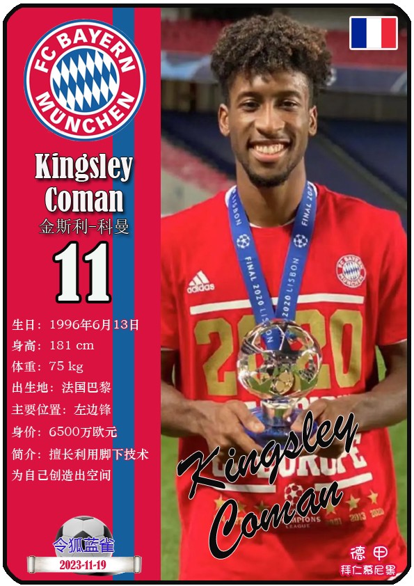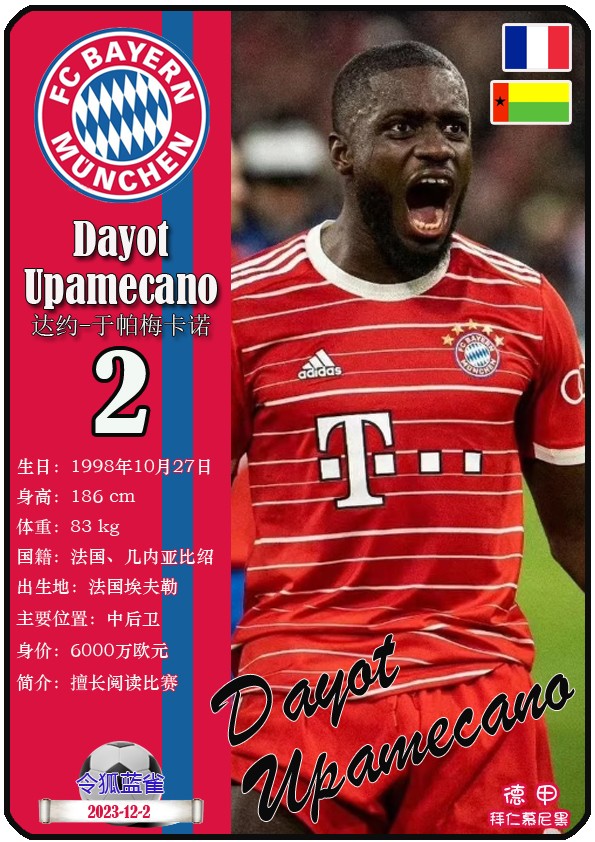 阿方索-戴维斯( 2023-11-25 093156)埃里克-戴尔( 2024-3-2 092106 )埃里克~舒波莫廷( 2024-3-2 001103 )布莱恩-萨拉戈萨( 2024-3-2 001105 )布纳-萨尔( 2024-3-2 092109 )达约-于帕梅卡诺( 2023-12-2 115008 )丹尼尔-佩雷茨( 2024-3-2 092128 )哈里-凯恩( 2023-10)贾马尔-穆西亚拉( 2023-10-19 230841 )金玟哉( 2024-1-14 005106 )金斯利-科晏( 2023-11-19 093200 )康纳德莱默( 2023-12-3 094457 )拉斐尔-格雷罗( 2023-12-3 094509 )莱昂-格雷茨卡( 2023-12-3 094501 )勒鲁瓦-萨内( 2023-11-10 232214 )马蒂斯特尔( 2023-12-3 094516)马泰斯德里赫特( 2024-3-2 092112)诺塞尔-马兹拉维( 2024-3-2 092117 )乔纳-库西阿萨雷( 2024-3-2 001108 )萨查-博伊( 2024-3-2 092114 )塞尔吉_格纳布里( 2023-10-21 124543 )斯文-乌尔赖希( 2024-3-2 092125 )塔雷克-布赫曼( 2024-3-2 092119 )托马斯-穆勒( 2023-12-3 094512 )亚当阿兹努( 2024-3-2 092122 )亚历山大-帕夫洛维奇( 2024-3-2 092103 )约书亚基米希( 2023-10)