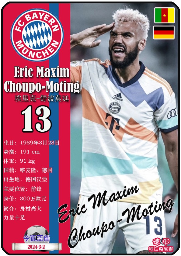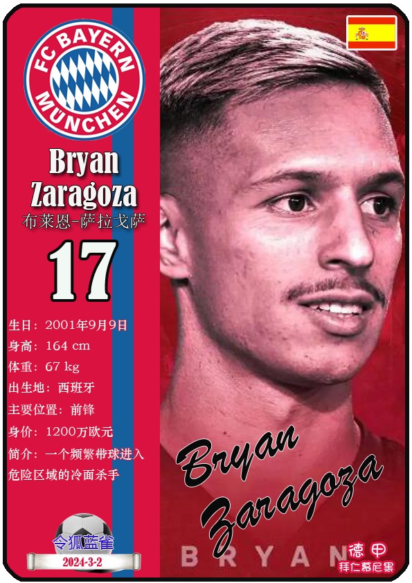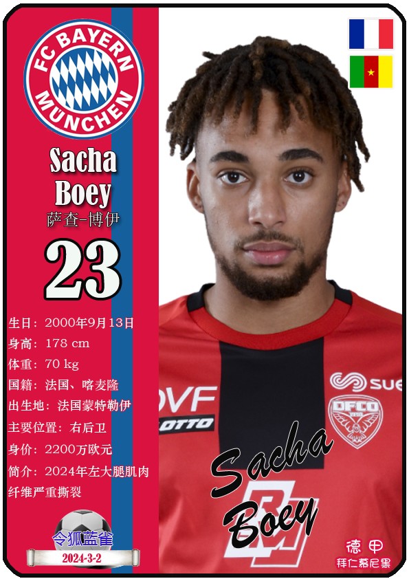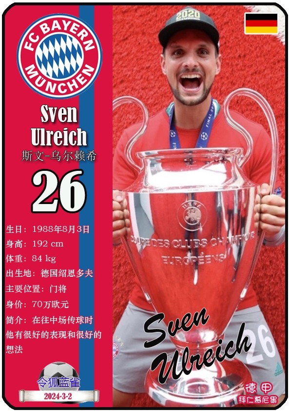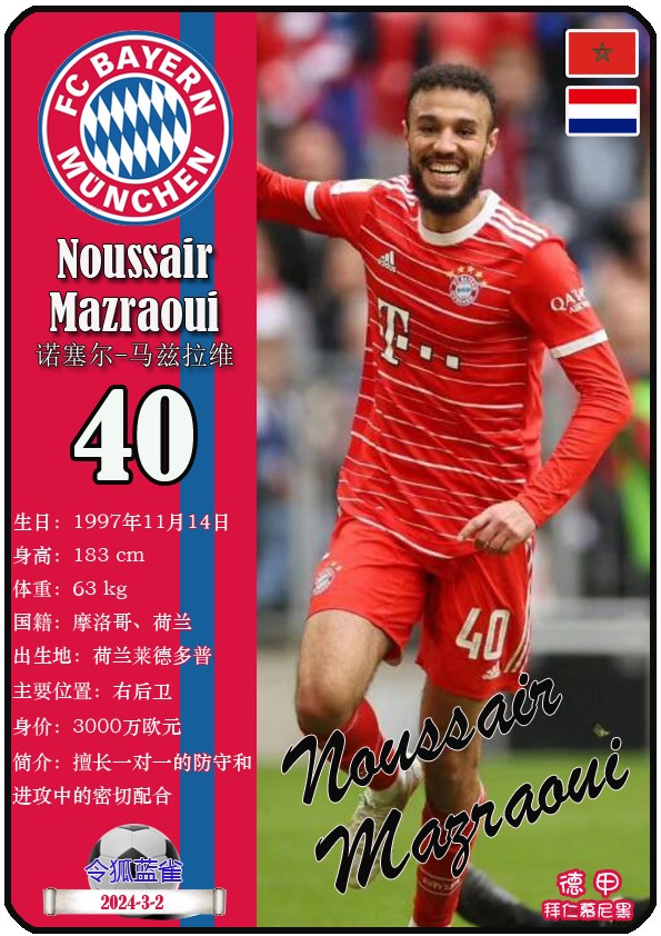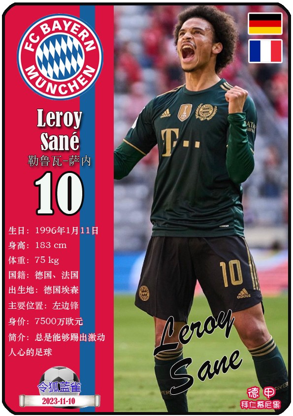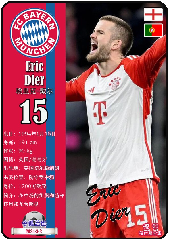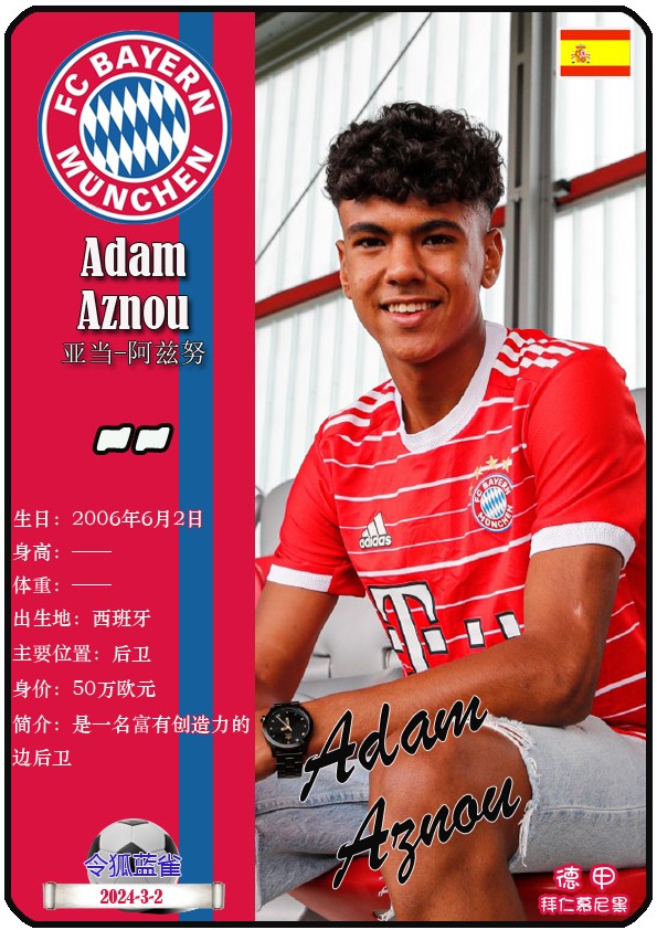 阿方索-戴维斯( 2023-11-25 093156)埃里克-戴尔( 2024-3-2 092106 )埃里克~舒波莫廷( 2024-3-2 001103 )布莱恩-萨拉戈萨( 2024-3-2 001105 )布纳-萨尔( 2024-3-2 092109 )达约-于帕梅卡诺( 2023-12-2 115008 )丹尼尔-佩雷茨( 2024-3-2 092128 )哈里-凯恩( 2023-10)贾马尔-穆西亚拉( 2023-10-19 230841 )金玟哉( 2024-1-14 005106 )金斯利-科晏( 2023-11-19 093200 )康纳德莱默( 2023-12-3 094457 )拉斐尔-格雷罗( 2023-12-3 094509 )莱昂-格雷茨卡( 2023-12-3 094501 )勒鲁瓦-萨内( 2023-11-10 232214 )马蒂斯特尔( 2023-12-3 094516)马泰斯德里赫特( 2024-3-2 092112)诺塞尔-马兹拉维( 2024-3-2 092117 )乔纳-库西阿萨雷( 2024-3-2 001108 )萨查-博伊( 2024-3-2 092114 )塞尔吉_格纳布里( 2023-10-21 124543 )斯文-乌尔赖希( 2024-3-2 092125 )塔雷克-布赫曼( 2024-3-2 092119 )托马斯-穆勒( 2023-12-3 094512 )亚当阿兹努( 2024-3-2 092122 )亚历山大-帕夫洛维奇( 2024-3-2 092103 )约书亚基米希( 2023-10)