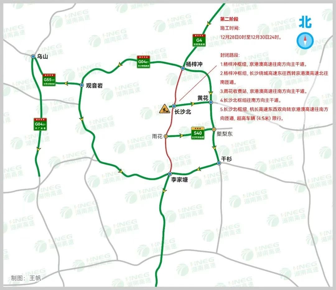 记者从湖南省高速公路交通警察局长沙支队获悉,G4京港澳高速湖南长沙段1509公里至1484公里处,李家塘枢纽至杨梓冲枢纽双向路段,将于12月24日至12月30日分阶段和时段开展施工。