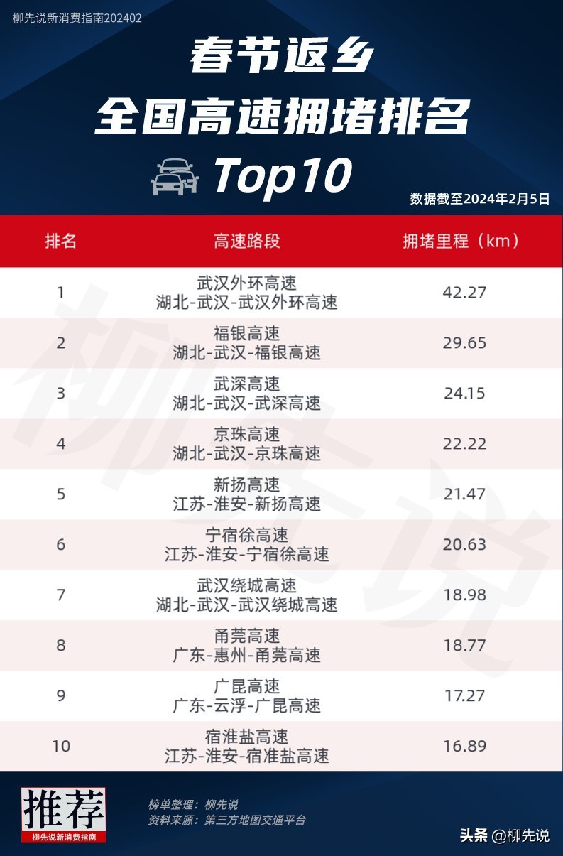 高速路“堵王”!春节返乡全国高速路拥堵排名:第一名堵了42公里