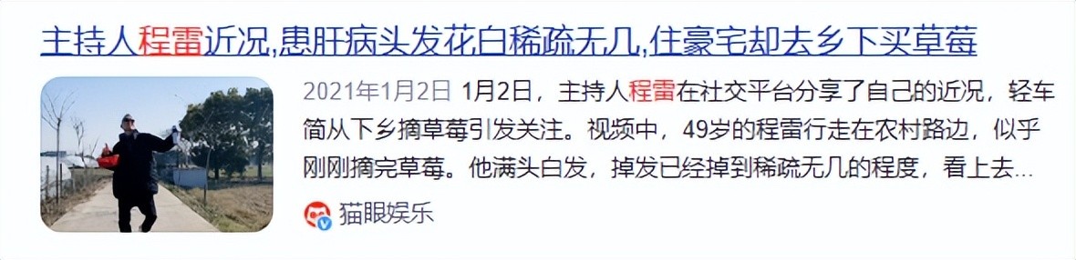 资料参考:2021-01-02猫眼娱乐——主持人程雷近况,患肝病头发花白稀疏无几,住豪宅却去乡下买草莓
