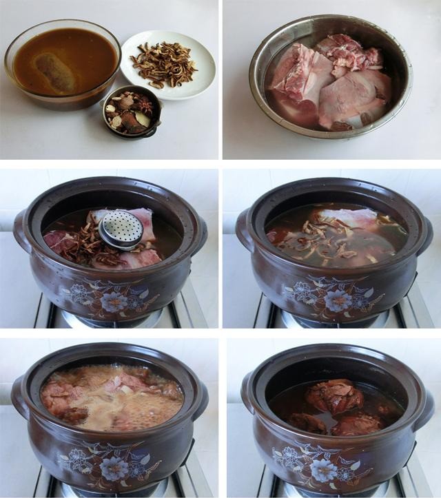 调料:葱1段,姜1 块,料酒10克,老汤1碗,八角1颗、桂皮1小块、香叶3片、花椒10克、干辣椒10克,豆蔻1个,草果2个,陈皮1块,盐5克,酱油15克。