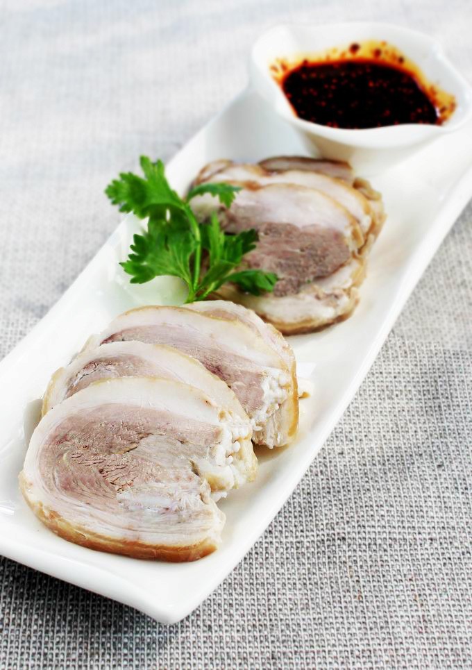 7、吃时取出切半公分的厚片,生抽、香醋、香油、蒜茸、辣椒油放入小碗中,调和成调味汁,和肘子一起上桌蘸食。