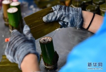 近年来,河南省洛阳市洛宁县利用当地山区丰富的绿竹资源,发展竹筒粽子扶贫产业,帮助当地村民脱贫致富。 新华社记者 冯大鹏 摄